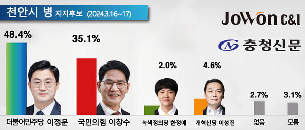 천안병 민주당 이정문 48.4% 국힘당 이창수 35.1%