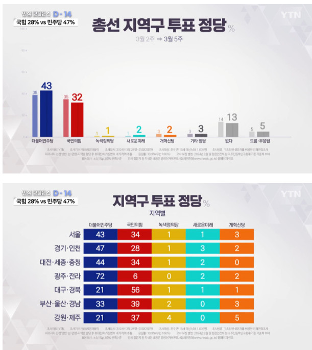 [22대총선 여론조사] 대전(7석) 동구,중구,서구갑을, 유성구갑을, 대덕구/세종(2석) 세종갑을