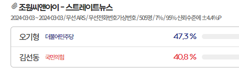 민주 오기형 47.3% 국힘 김선동 40.8%