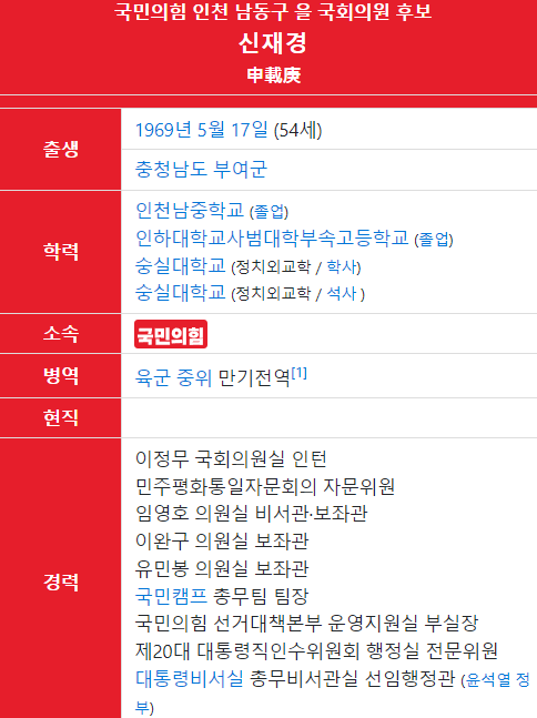 국힘당 신재경은 숭실대를 나와 국회의원 보좌관, 현 대통령실 총무비서관실 선임행정관이다. 이것 이외에 알려진 게 없다. 너무 정보가 없어 경력을 올린다.