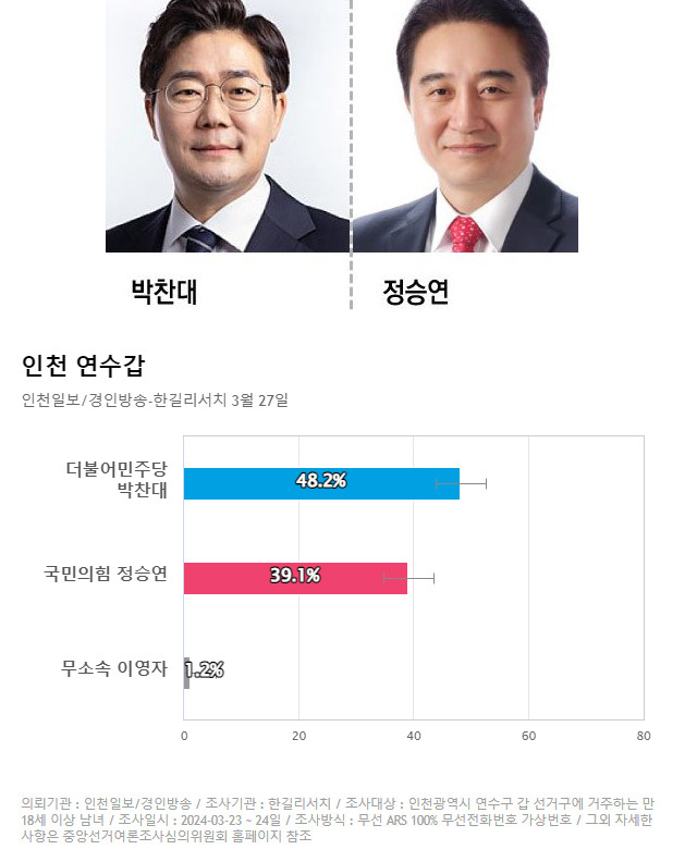 더불어민주당 박찬대 후보 48.2%, 국민의힘 정승연 후보 39.1%, 무소속 이영자 후보 1.2%
