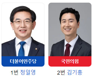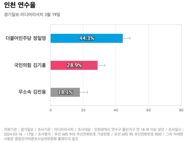 민주당 정일영 후보 44.3%, 국민의힘 김기흥 후보 28.9%, 무소속 김진용은 사퇴