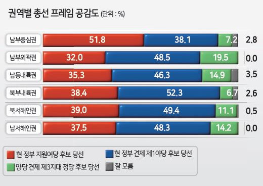 경기도 선거에서 더불어민주당의 선거 프레임인 ‘정권 심판론’이 우세한 것으로 확인됐다. 의정부, 남양주 등이 포함된 경기도 북부내륙권에서 ‘정권 심판론’ 여론이 가장 거셌고, 수원과 용인이 포함된 남부중심권에서만 경기도 권역 가운데 유일하게 ‘정권 지원론’이 높았다. 경기도 판세의 캐스팅보트 역할을 할 중도층 역시 ‘정권 심판론’에 힘을 실어주는 것으로 분석됐다.