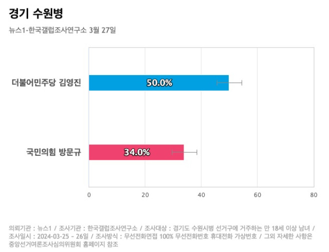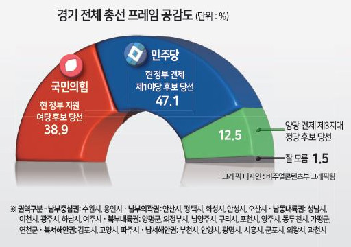 현재 경기도는 민주 27곳·국힘 7곳 우세 전망을 하고 있다. 일부 선거구를 대상으로 한 여론조사에서도 두 정당의 지지율은 수원병에서 박빙을 보인 반면 화성을·시흥을 등에선 민주당 지지율이 압도적으로 앞섰다.