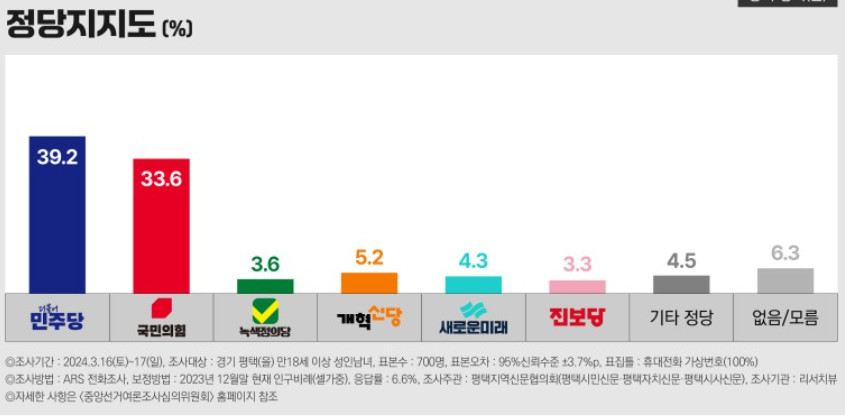 원래 보수 색채가 강한 지역이었으니 삼성전자 공장 건설과 신도시개발로 젊은 층이 많이 유입 보수와 진보가 혼전 중이다. 18.19.20 국힘당 계열 원유철이 당선, 21대는 민주당 홍기원이 당선 되었는데 약 2.8% 차이로 승리한 지역.