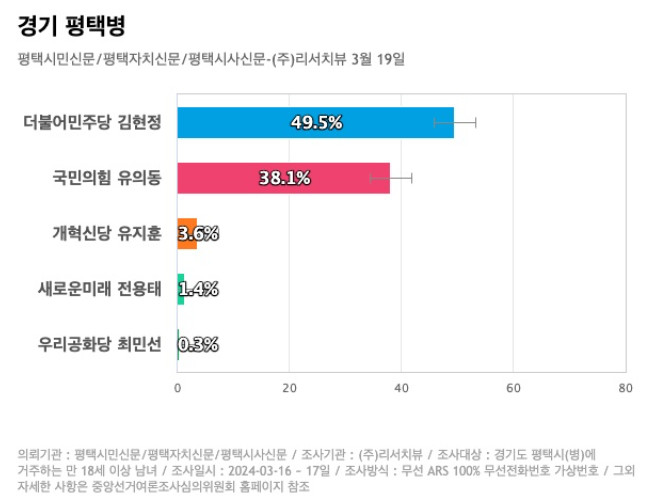 민주당 김현정 후보 49.5%, 국민의힘 유의동 후보 38.1%