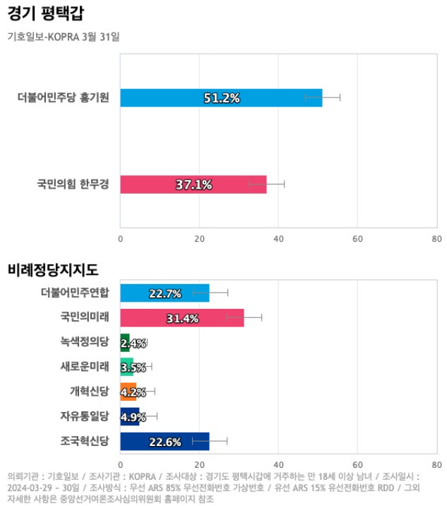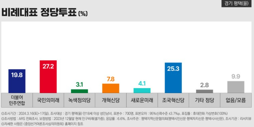 비례정당지지도는 더불어민주연합 22.7%, 국민의미래 31.4%, 조국혁신당 22.6%