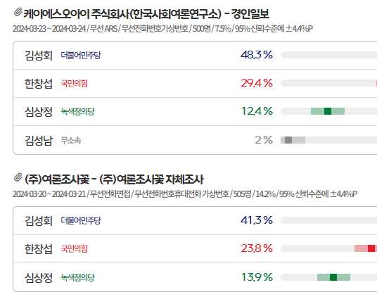 민주당 김성회 후보 41.3%, 국민의힘 한창섭 후보 23.8%, 녹색정의당 심상정 후보 13.9%