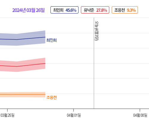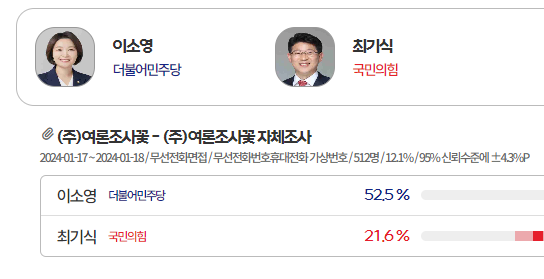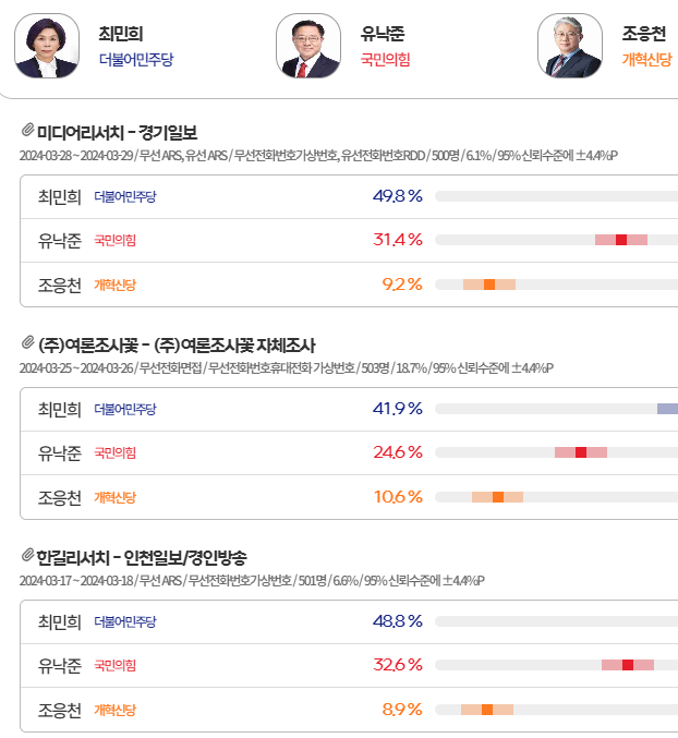 민주당 최재성이 3선 조응천이 2선을 한 지역이다.국힘당을 허용 하지 않는 지역. 조응천이 탈당 개혁신당으로 출마했지만 10%의 지지도 못받는 중이다 크게 반등이 없는 최민희의 선두 질주다.