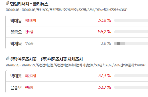 현재 각 여론조사를 보더라도 민주당이 우세다 부산까지 흔들리고 울산 경남도 여진이 세다. 물론 대구 경북은 굳건하지만. 여기에 강원도까지 흔들리면 국힘당은 100석 근처도 힘들다. 여론