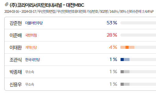 김종민은 6%도 안되는 지지율을 보였다가 40%를 넘나들고 있다.