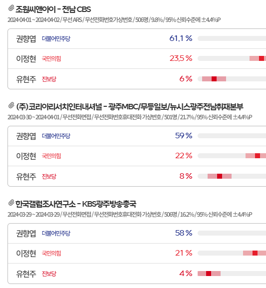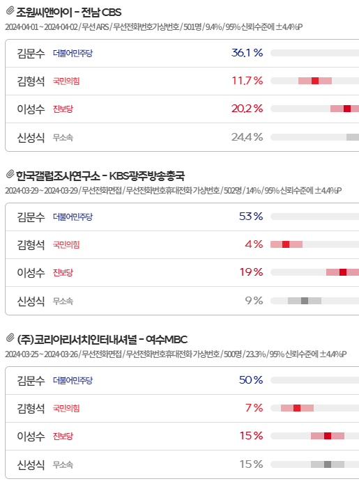 커뮤니티 pgr21 피프로스 분이 정리한 전국 우세 상황 정리한 것을 옮긴다. 중도 성향의 커뮤라서 댓글도 보면 좋다. https://pgr21.com/election/6347 초접전지역이라도 여론조사상 1%라도 높으면 우세로