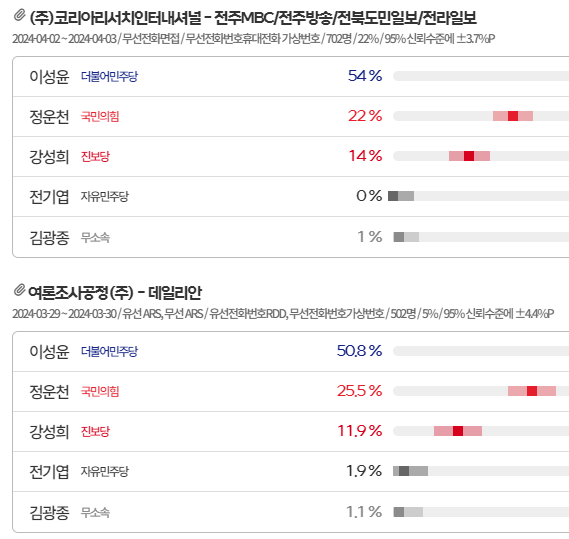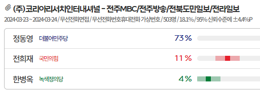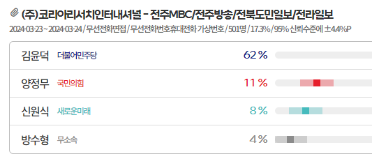 관전 재미는 국힘당 정운천이 몇%의 지지율을 받는지 선거비는 보전받을 수는 있는지, 그리고 현직 진보당 강성희는 어떨지 보는 것이다.