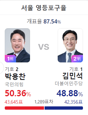 김민석/박용찬 접전이네. 지역구 일 안했나? 민석이는 또 정치 꼬일려나...21대에 진땀승을 했으면 지역에 올인 했어야지....어찌 비오는날에 쏘세지빵 앵커한테 이리 진짬을 흘리냐.