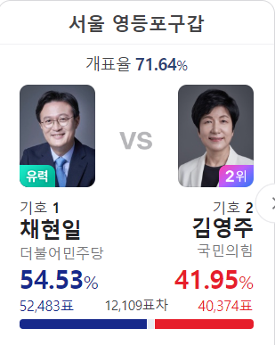 채현일 당선 유력, 김영주는 이제 정치 말년이 똥맛이겠다. 국힘당에서 막후 정치력은 있을 수도 없을테니, 윤석열이 한자리 줄려나.
