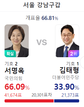 박정훈 당선 확실, 조재희는 이번에도 낙선이다.정책 전문가로 능력이 너무 아깝다. 김웅과 붙어서 47% 득표를 했었는데