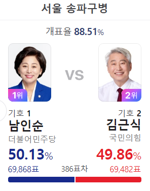 와...남인순이 지다니. 종부세 광풍이 불때도 김근식에게 21대에 9.3% 이겼었는데 역전을 노리자