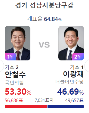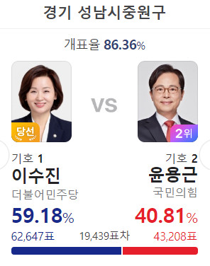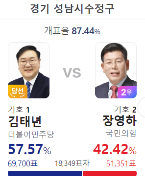 김태년 당선 성남 수정은 김태년이 4선한 지역구다. 21대 총선에서는 60.31%로 당선 되었는데 득표율이 떨어졌다.
