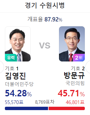 김영진 당선, 김근태 보좌관 출신으로 19대 수원병 출마 했으나 남경필에게 패함, 20대에는 김용남을 이기고 당선, 21대에도 무난히 당선 되었다. 이번이 3선