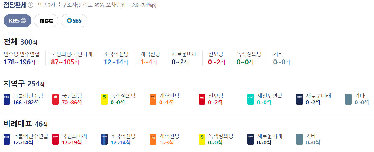 JTBC 출구조사 결과 더불어민주당과 비례위성정당인 더불어민주연합이 168~193석, 국민의힘과 위성비례정당인 국민의미래는 87~111석