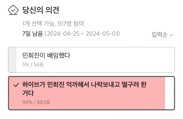 여론은 민희진에게 좋지 않았다. 하이브의 힘이겠지만 그렇다.