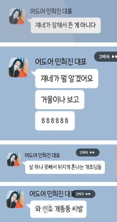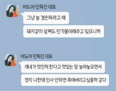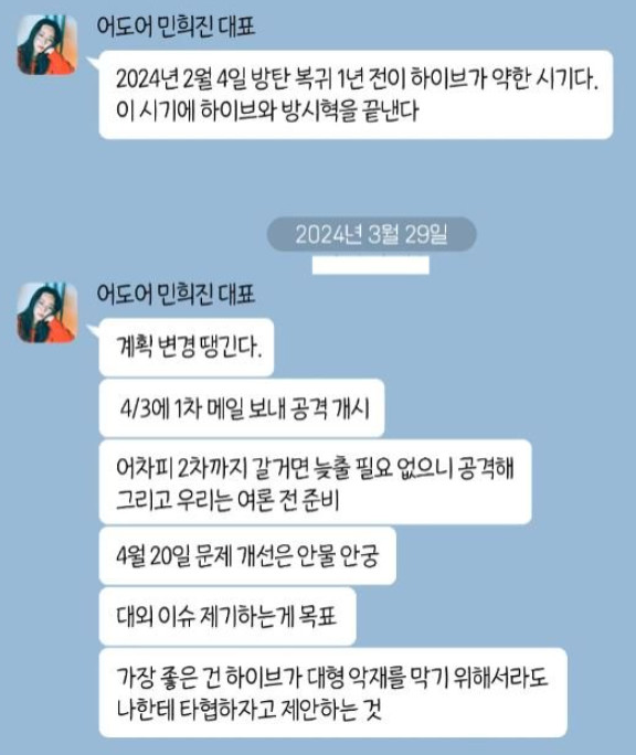 심문 과정에서 하이브 측은 민 대표가 뉴진스 멤버들을 무시하고 비하하는 측근들과의 대화 메시지를 공개하려 했다. 다만 민 대표 측이 이의를 제기하며 법정에서 공개되진 않았다. 민 대표 측은 또 하이브 측이 공개한 여성비하 발언에 "말도 안 된다"며 어이없다는 반응을 보이기도 했다./ 기사 읽어 보길 권함.