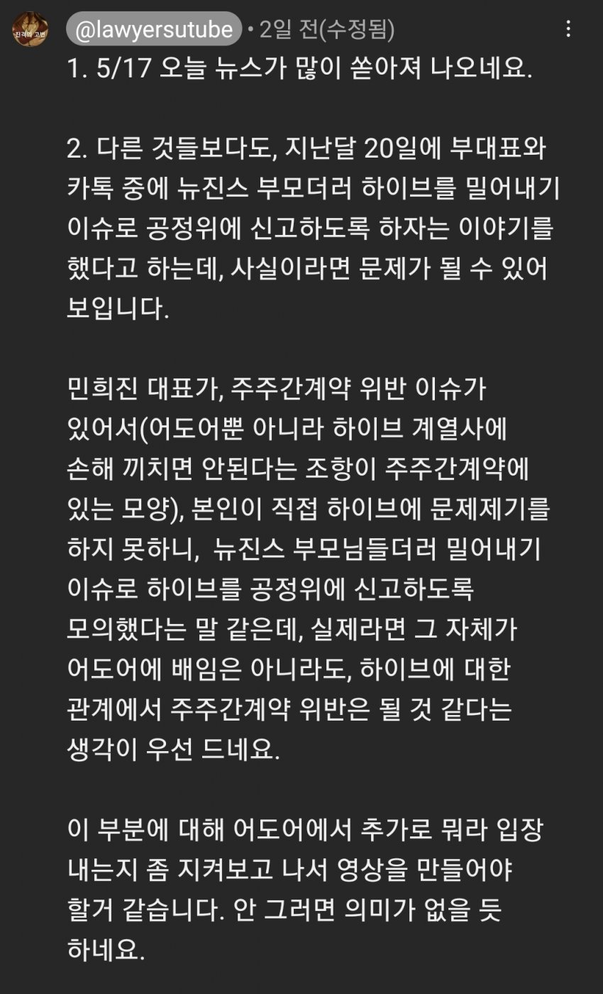 다들 말투와 문장에만 집중하는데 저 말투는 이진호의 구성?이고 전체 그림도 같이 봐야 합니다. 솔직히 이런 언플들이 나오는 이유는 민희진의 이미지 조지기입니다. 앞으로 더 많은게 나올거라고 예상을 해요.