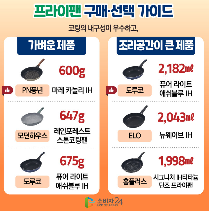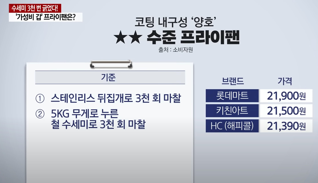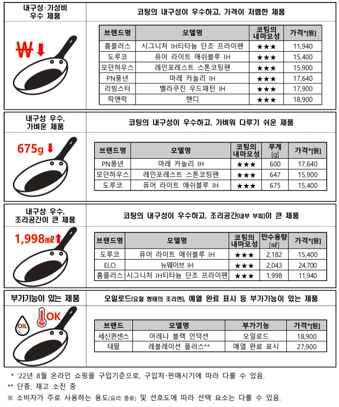 이번에 시험한 제품 중 가장 비싼 프라이팬과 가장 저렴한 프라이팬인데 모두 코팅 내구성은 '우수' 등급이었습니다. 반면, 인지도가 가장 높은 이 프라이팬은 내구성이 '보통'으로 코팅 우수성과 가격, 브랜드 인지도가 꼭 비례하지는 않은 것으로 조사됐습니다. 소비자원이 고른 가성비 좋은 프라이팬은 브랜드가 덜 알려진, 가격이 대부분 2만 원 미만인 제품이었습니다.