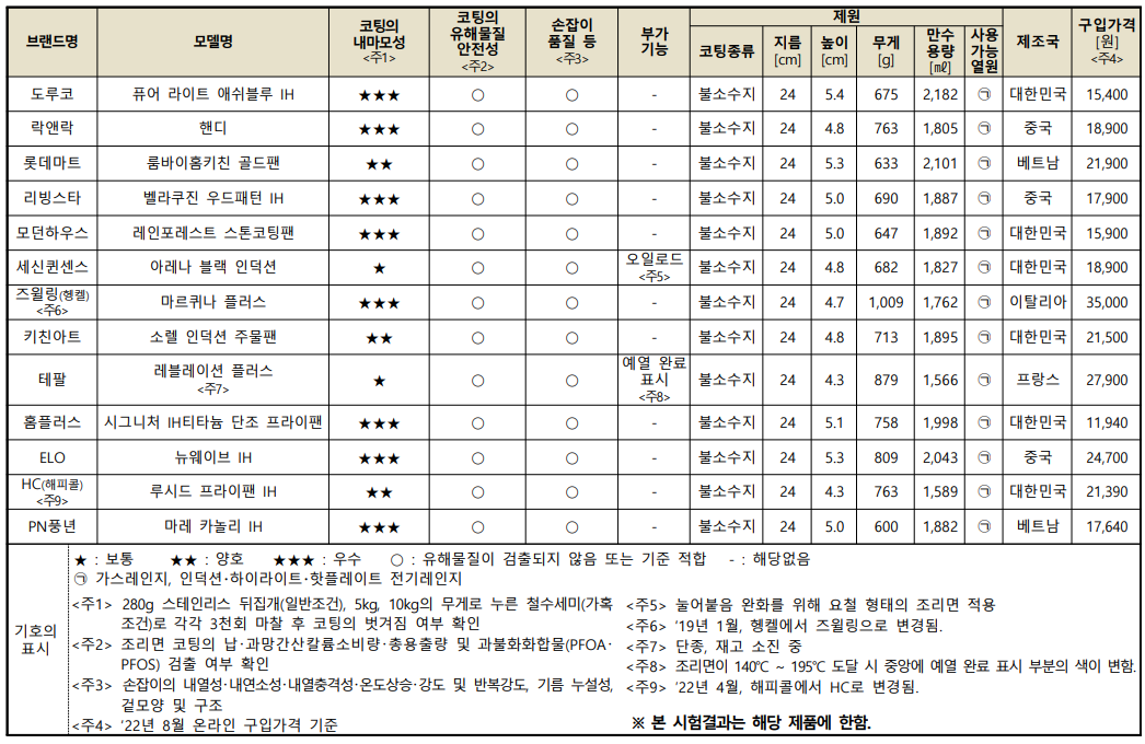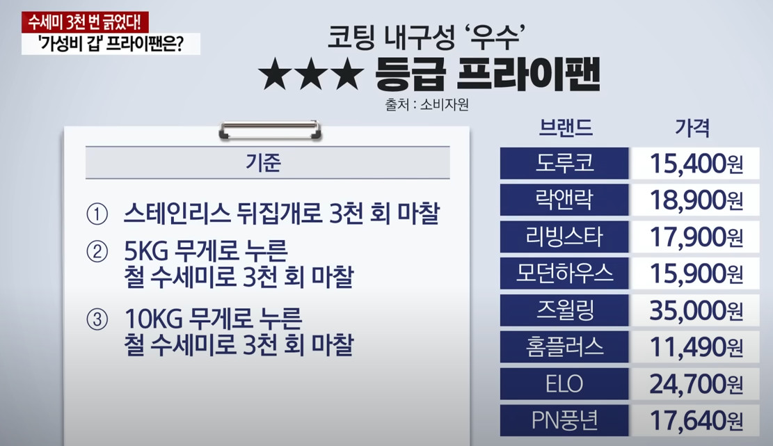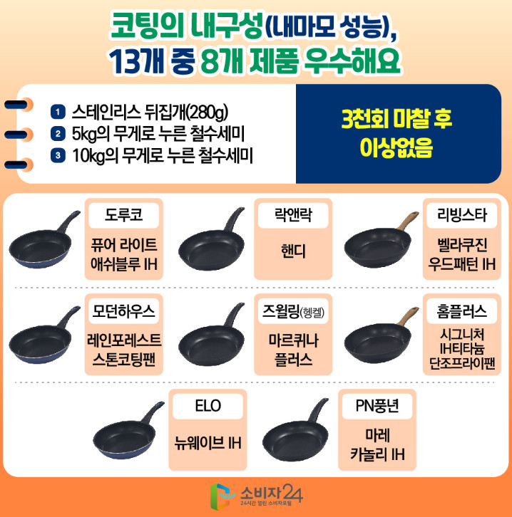 도루코와 락액락, 리빙스타, 모던하우스, 즈윌링, 홈플러스, ELO, PN풍년 등 8개 제품의 코팅 내구성은 10kg으로 누른 철 수세미와 스테인리스 뒤집개로 3천 번씩 긁어도 코팅이 벗겨지지 않은 '우수' 등급이었습니다.