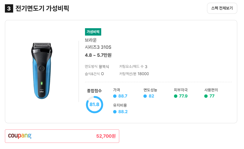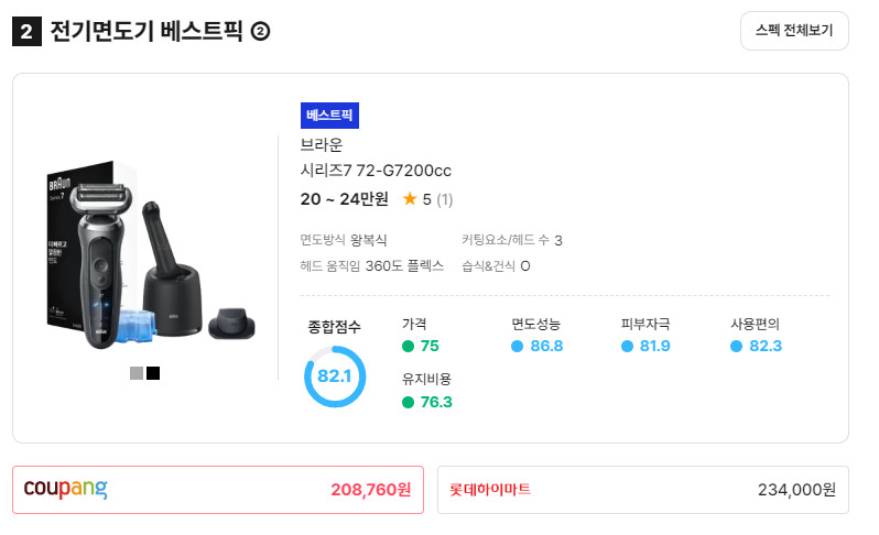 직접 테스트해본 9개의 전기면도기 중 무의식적으로 가장 먼저 손이 가는 면도기였으며, 테스트에 참가한 인원 중 90%가 가장 면도성능이 좋은 전기면도기라 평가했을 정도로 호불호가 갈리지 않는 제품입니다.