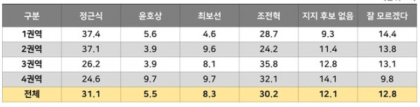 여기서 3 권역은 좀 이상하긴 하다. 양천구 표본이 높았나? 정당 지지율과 다른 양상인데?