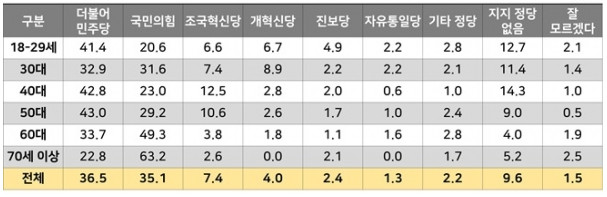 정당지지도 민주당 36.5%, 국민의힘 35.1%, 조국혁신당 7.4%, 개혁신당 4.0%