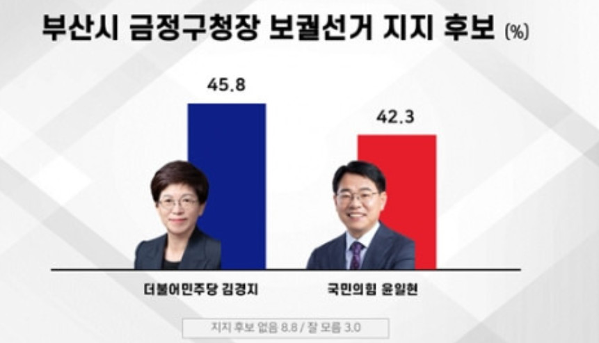 | 부산시 금정구청장 보궐선거 여론조사/민주당 김경지 45.8% vs 국민의힘 윤일현 42.3% (0) | 2024.10.10 |