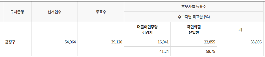 부산금정구청장 윤일현 58.75%, 민주당 김경지 41.24%