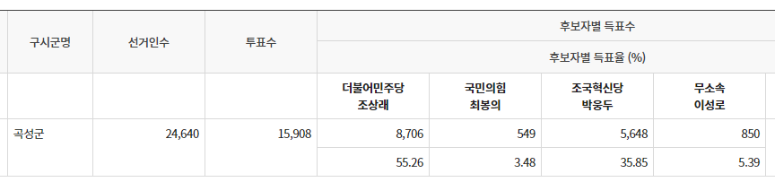전남 곡성군수는 조혁당과 막상막하로 싸울 줄 알았는데 일방적으로 민주당 조상래가 이겼네요