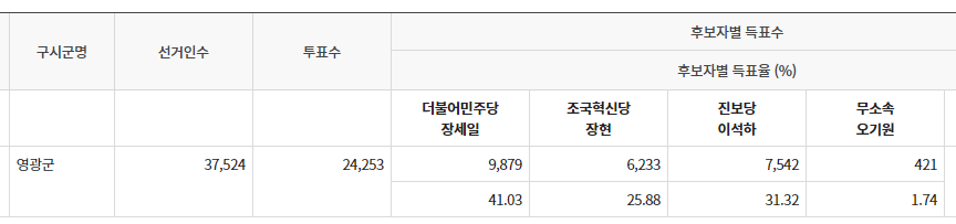 영광군수는 놀랍게도 조혁당이 진보당에게도 졌네요.