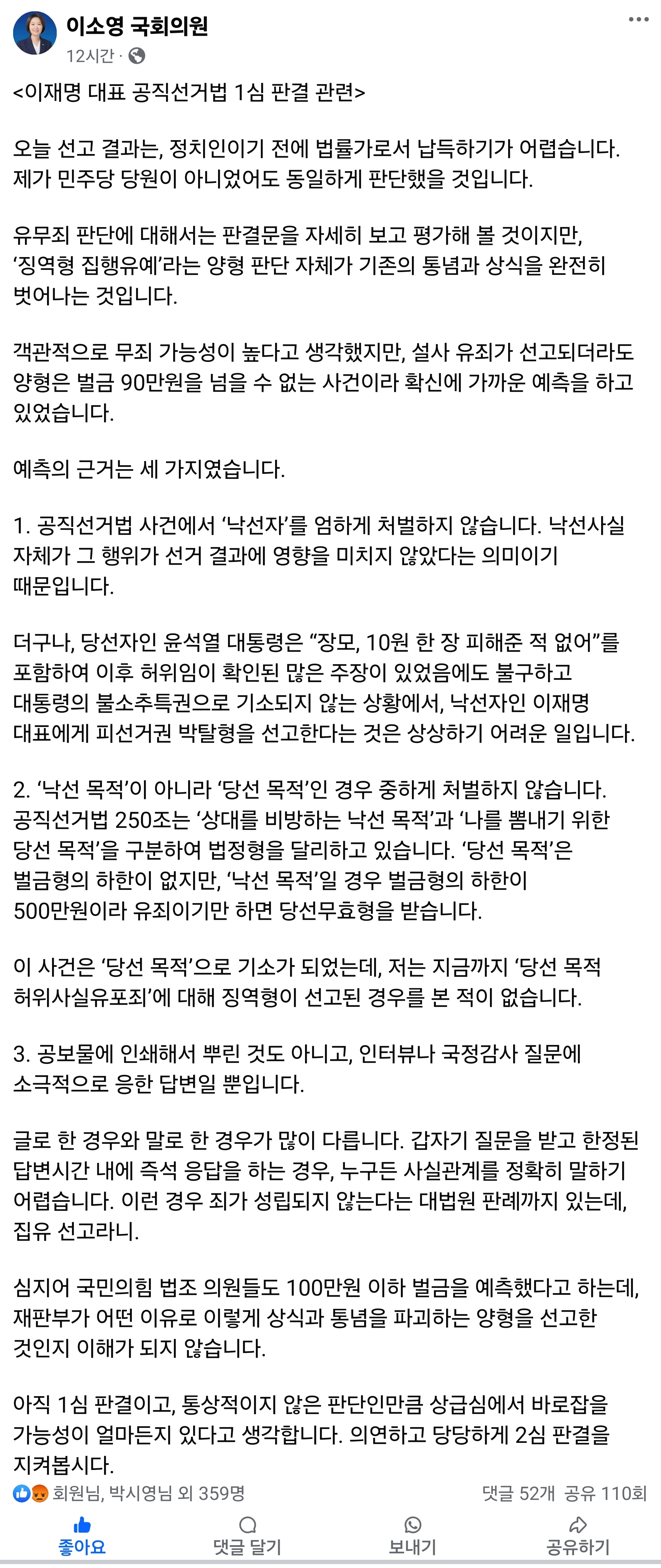 아마도 앞서 이재명 부인 김해경의 재판 결과를 보고 더 그렇게 생각이 든것 같았다.