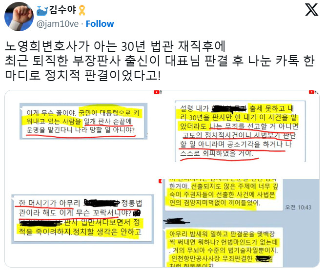 이번 이재명의 판결을 내린 한성진 판사가 어떤 판사인지는 모른다. 다만 재판은 판사의 심정 추측만으로 판결하면 개떡같은 판결이 된다. 증인의 말도 자기 입맛에 따라 배척하기도 외면하기도 하는게 판사들의 법이다. 판사는 자신의 소신대로 했다고 생각하겠지만 그 소신이 상식을 벗어나면 죽은 소신이고 판사는 소신으로 움직이면 안된다.