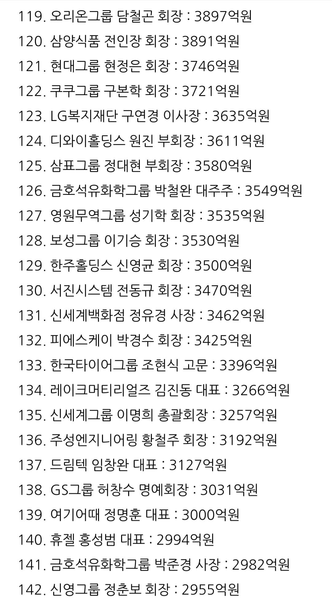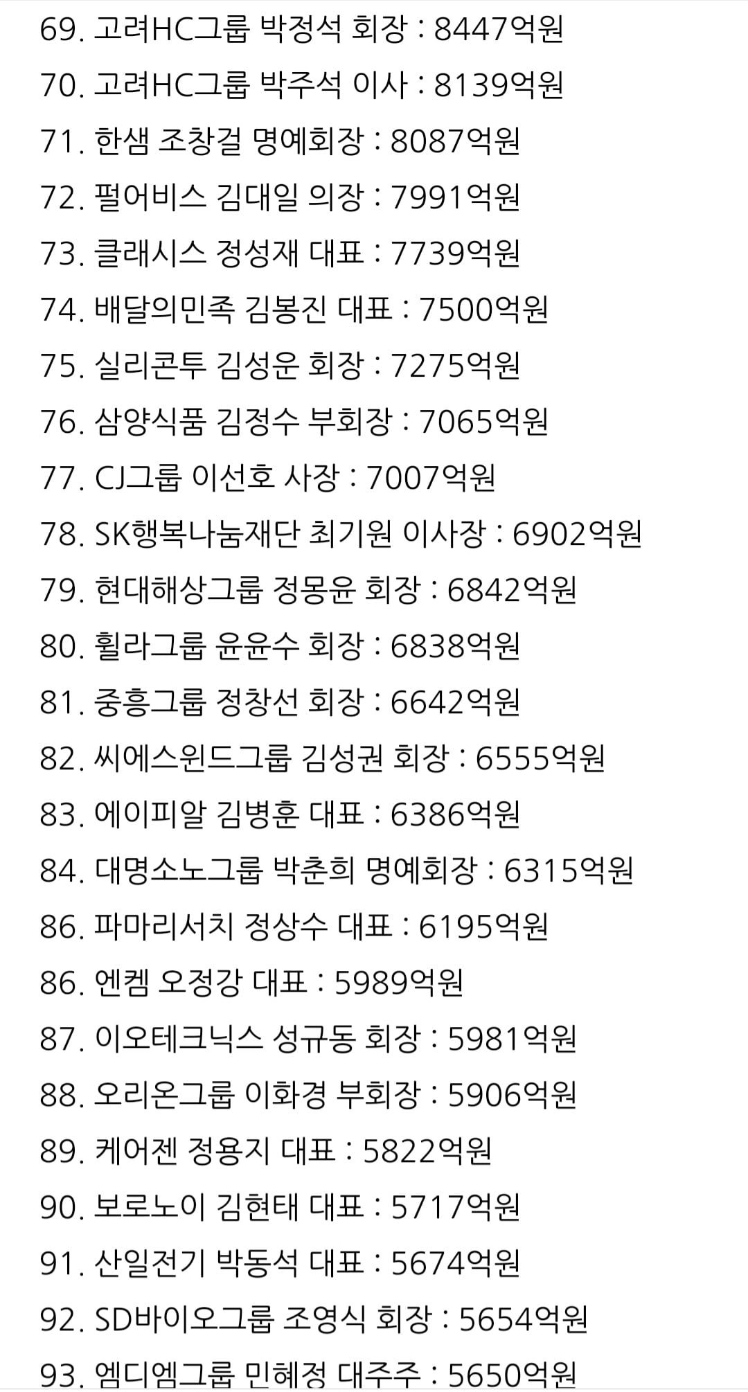 95위 롯데 신동빈 5488억원은 더 놀랍네요. 일본 재산은 뺀거겠죠?