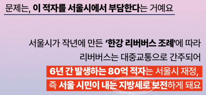서울시 미래한강본부는 서울시의회에 제출한 ‘한강 리버버스 운영사업 실시 협약서 동의안’ 리버버스 운영 비용추계서에서 2024~2029년 약 80억900만원의 적자를 기록할 것으로 예상했습니다. 적자는 △2024년 5억900만원 △2025년 20억3400만원 △2026년 18억8000만원 △2027년 14억3300만원 △2028년 11억4300만원 △2029년 10억1000만원으로 해마다 다르게 전망했다.