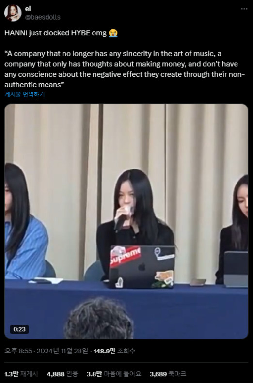 이번 기자회견에 부정적인 판단을 하는 변호사들도 있는데 이들은 뉴진스 측 변호사들이 뭘 가지고 있는지 하나도 모르는 상태에서 판단한다는 점을 간과하고 있어, 뉴진스 측이 아직 보인적 없는 문건을 가지고 있다는 것은 기본이다 그 내용이 핵폭탄인지 아닌지는 모르겠지만 그걸 다 따져서 움직일거라는 것은 상식이다.