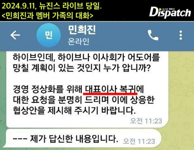 디스패치 기사를 보면 가장 중요한 지점은 민희진과 뉴진스 가족 간의 텔리그램 대화가 디스패치 손에 들어갔다는 것이다. 이건 분열이 일어났음을 알리는 거라고 본다.