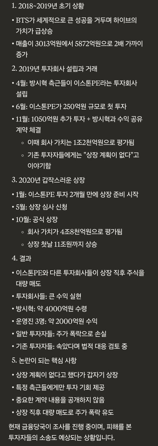 4. 사모펀드는 보호예수 안 걸린 주식을 상장 후 금방 팔았고, 이득의 30%인 4000억은 방시혁에게 지급했다. (문제 없음)