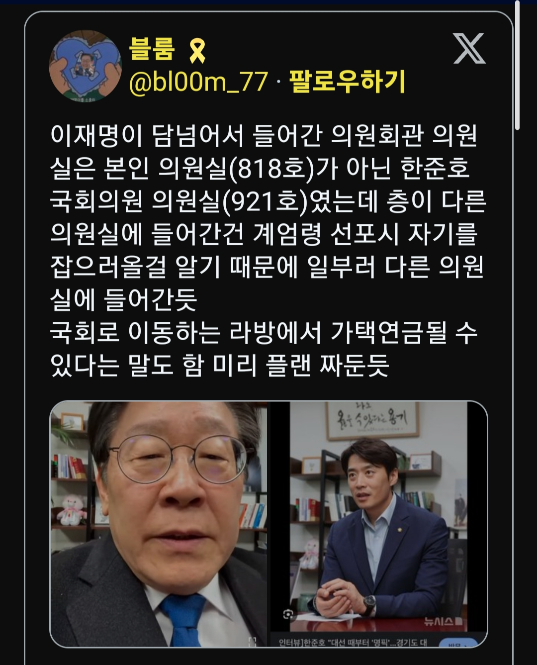 이재명은 담넘어 들어간 후 자기 방이 아니라 한준호 방으로 가는 재치를 보여서 체포 되지 않았네요.