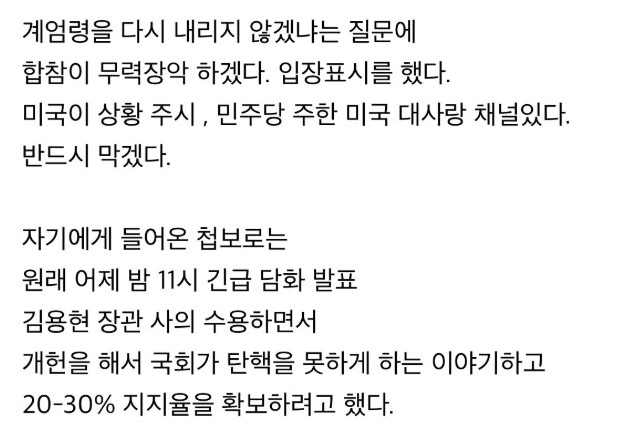 계엄인지도 모르고 불려들어와서 계엄선포하면서 계엄사령관 앉히고 계엄포고령도 미리 누군가가 작성한거 전달하고 서명하라고 하자 법적검토가 필요한거 같다라고 김용현 국방장관에서 건의하니 이미 다 끝낸거니 발표하라고 해서 시간만 수정하고 발표