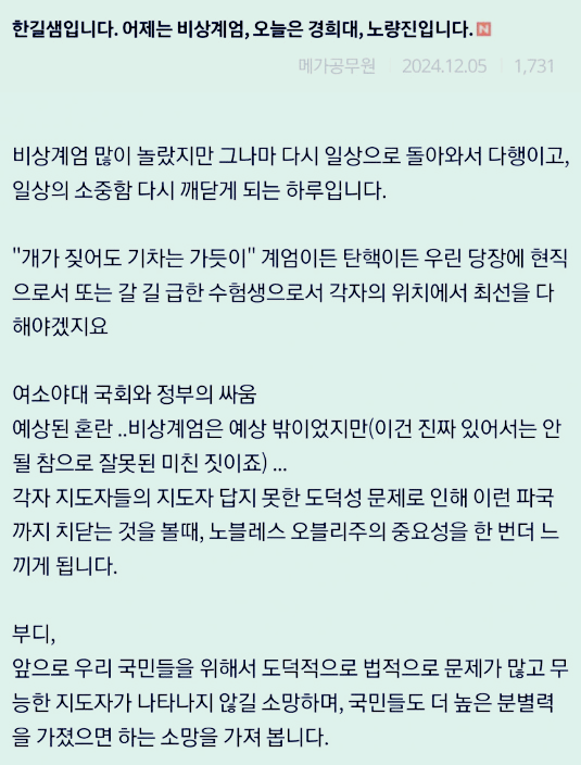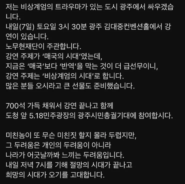 저 말할떄가 탄핵을 하지 않으면 제2비상계엄이 터질지 모르는 상황을 걱정하던 시간이었어요. 더 이상 문제를 확대 하지말자고 하는 말을 어떻게 해석해야하나 싶었죠.