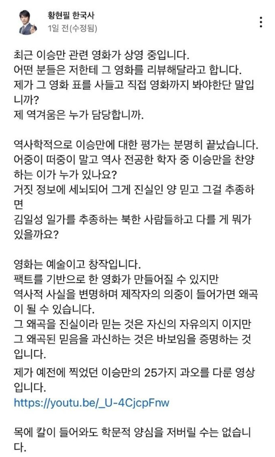 황현필은 이승만 미화 영화라면서 건국전쟁을 비판 했습니다.
