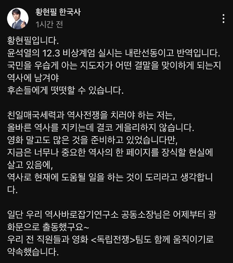역사학자 중에 대표적 좌파 진보 인 태백광노 한국사 황현필은 이번 비상계엄에 대해 이렇게 행동합니다.