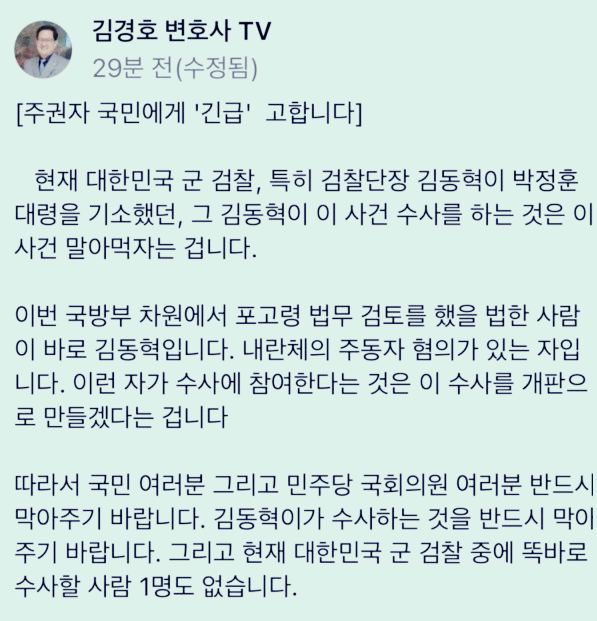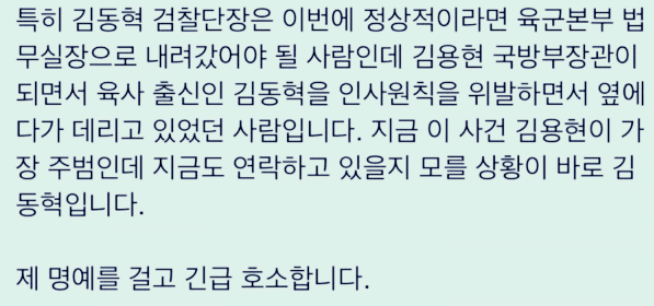 게다가 김동혁 군 검찰단장은 김용현이 데리고 있던 넘이라고 한다 이 넘은 박정훈 대령을 기소 한 군검사다. 채해병 특검이 시작되면 조사 받아야 할 넘인데...( 민주당과 다른 분들이 난리 쳐서 이넘은 빠졌다)