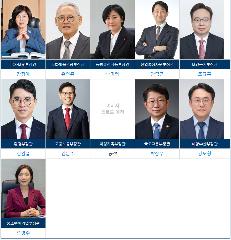 대통령 : 윤석렬, 총리 : 한덕수, 부총리 : 최상목, 국방장관 : 김용현, 행안장관 : 이상민, 법무장관 : 박성재, 외교장관 : 조태열, 통일장관 : 김영호, 복지장관 : 조규홍, 농식장관 : 송미령, 중기장관 : 오영주